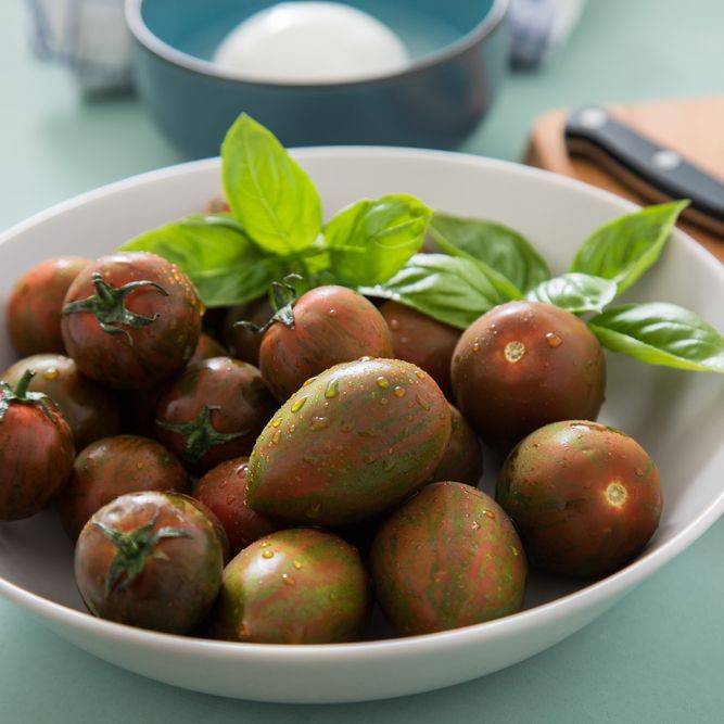 A showstopper in both garden and kitchen, Lucky Tiger Tomato dazzles with its elongated shape, tangy-sweet flavor, and striking color. These slender, 2–3" fruits ripen from green to golden with deep, emerald striping, creating a marbled appearance that’s as beautiful as it is appetizing. Each bite offers a perfect balance of sweetness and acidity, reminiscent of green apple and citrus — refreshing, zesty, and bright.